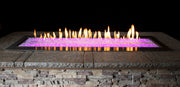 The 65,000 BTU natural gas burner pan is illuminated by a multi-color LED lighting system with seven color options - Deep Blue, Royal Violet, Cardinal Red, Sea Green, Tranquil Blue, and White. The LED light intensity can be adjusted, and the color can be set to one color or cycle through all seven either quickly or gradually. The LED control buttons, push button ignition, and variable flame control knob are concealed under a tilt-up cover to protect them from the outside elements.